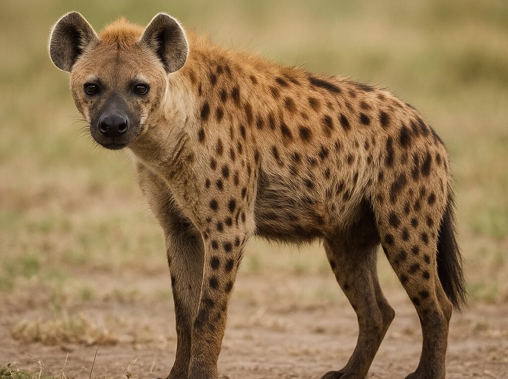 Hiena cętkowana ma masywną sylwetkę, mocną głowę i charakterystycznie obniżony grzbiet — przednie kończyny są wyraźnie dłuższe niż tylne, co nadaje jej pochyłą postawę. Długa szyja i potężne szczęki pozwalają na rozkruszanie kości, co wyróżnia ten gatunek spośród innych drapieżników.