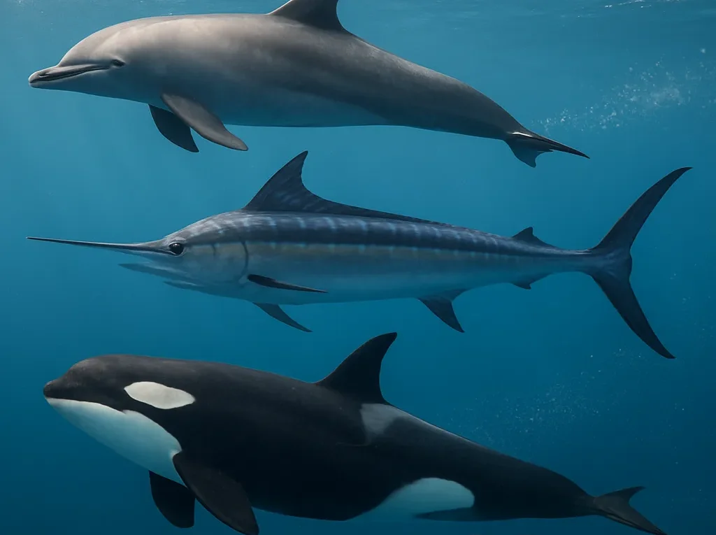 Delfiny, szczególnie delfin zwyczajny (Delphinus delphis), również należą do czołówki najszybszych pływaków. Osiągają prędkości zbliżone do 60 km/h w krótkich sprintach. Często można je obserwować, gdy płyną w kilwaterze statków, wykorzystując powstające tam zawirowania wody, aby oszczędzać energię. Ich sposób pływania łączy w sobie szybkość, zwinność i zdolność do wykonywania akrobatycznych wyskoków nad powierzchnię oceanu.