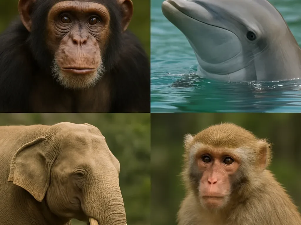 Delfiny i słonie łączą kilka kluczowych cech: mają duże, złożone mózgi, prowadzą skomplikowane życie społeczne, wykazują długotrwałą pamięć oraz umiejętność uczenia się przez obserwację. U obu grup zaobserwowano zachowania interpretowane jako żałoba, empatia i samoświadomość (test lustra). Dodatkowo przekazują tradycje kulturowe między pokoleniami, co zbliża je do człowieka pod względem bogactwa zachowań.